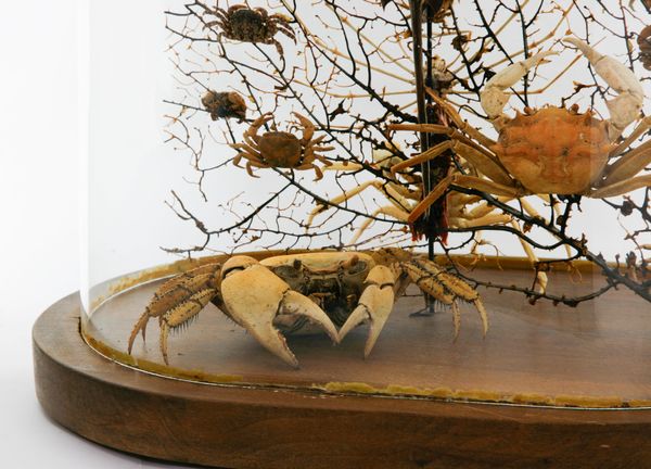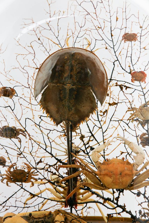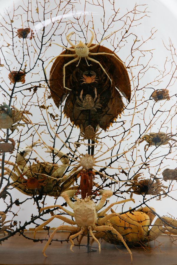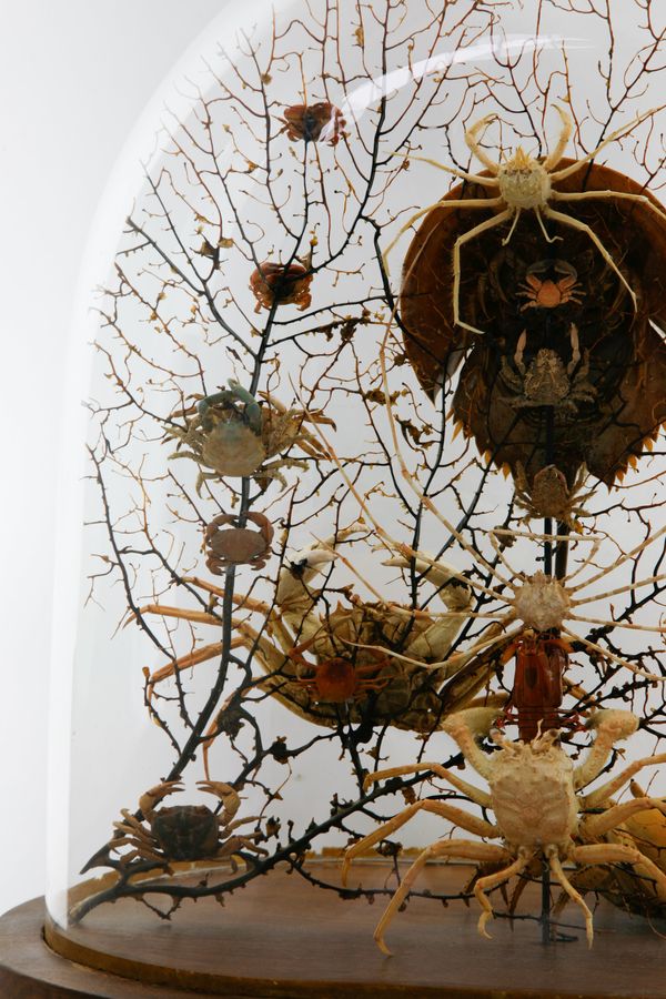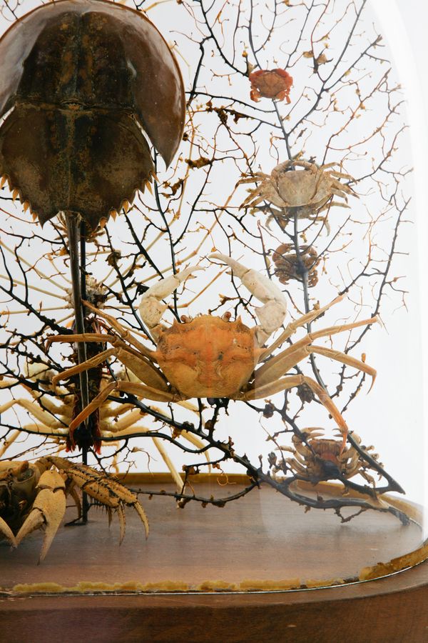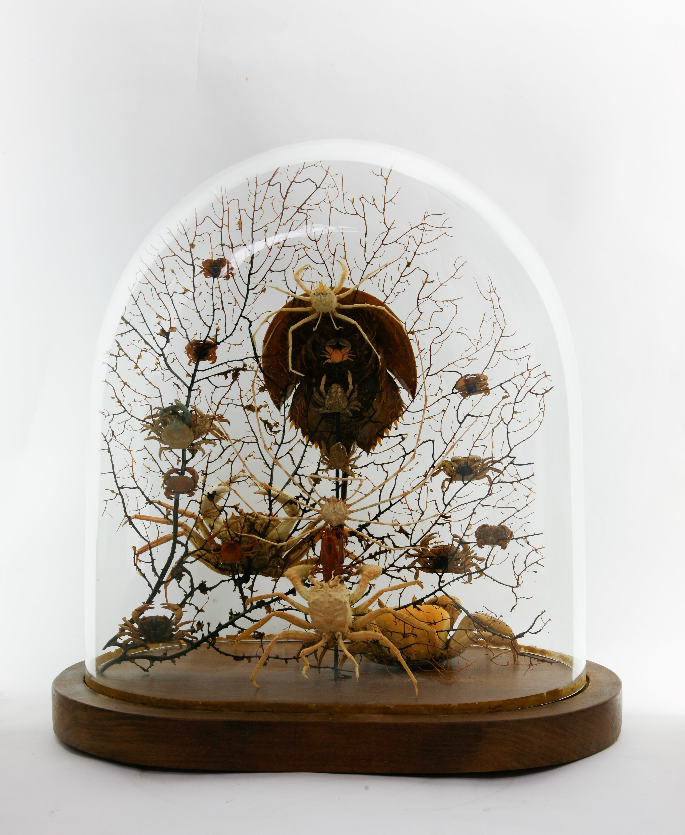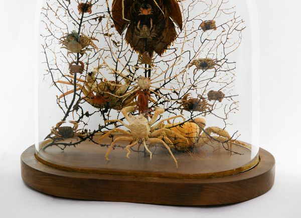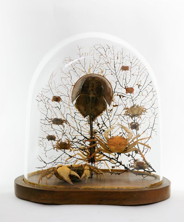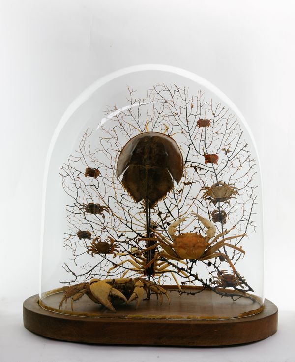Reclaimed early 20th century dome refurbished with a curious amalgamation of crustaceans (spider crabs, horseshoe crab etc…) and black bubble sea fan background