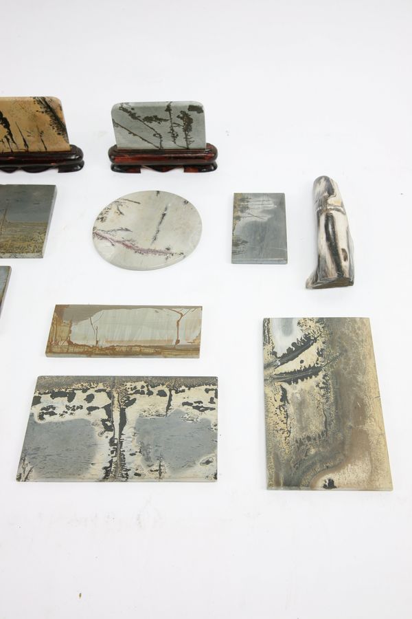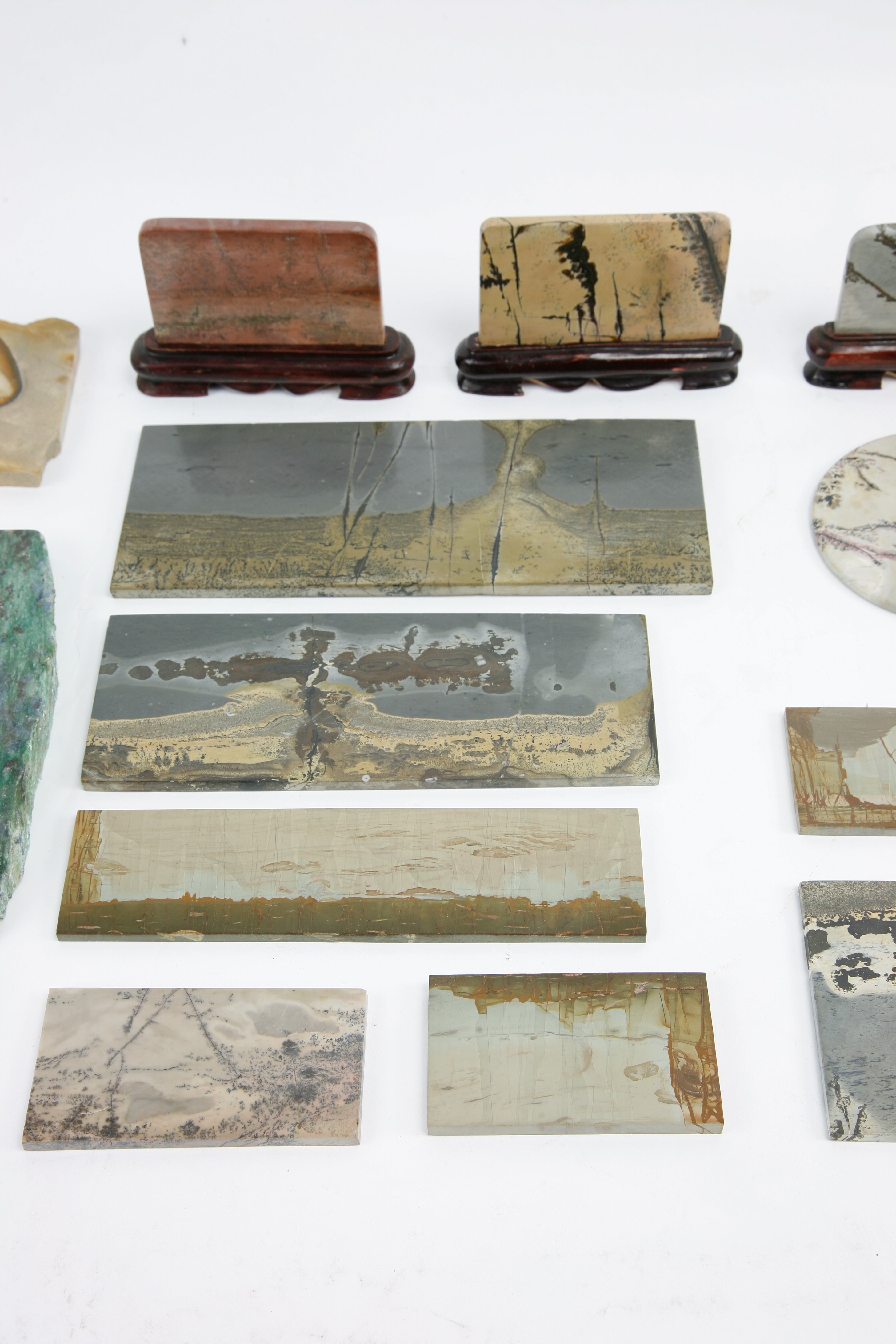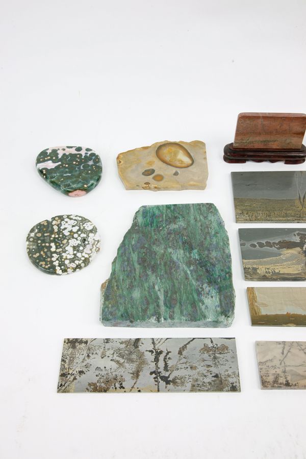 A collection of mineral specimens mainly comprising of ruin stone